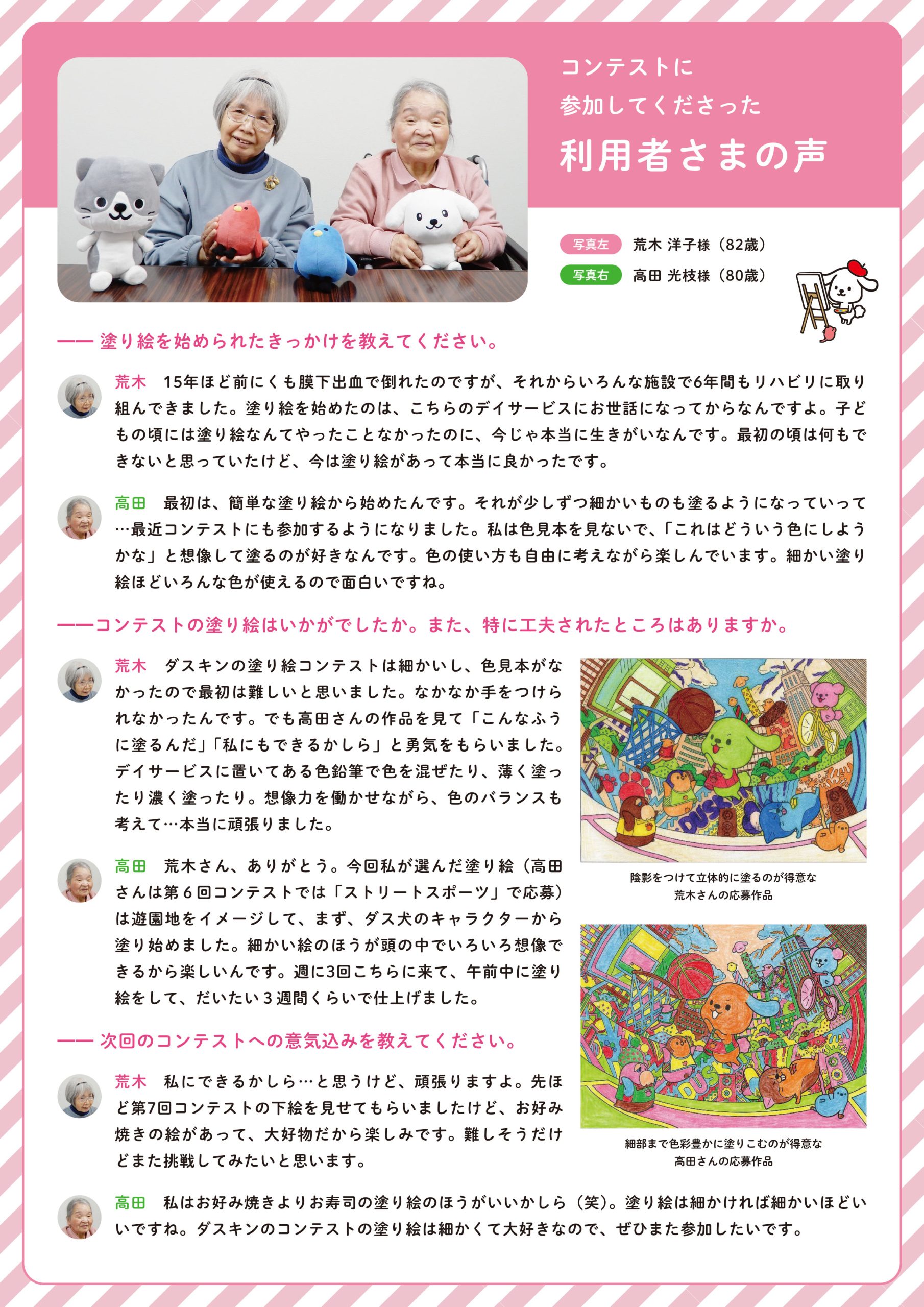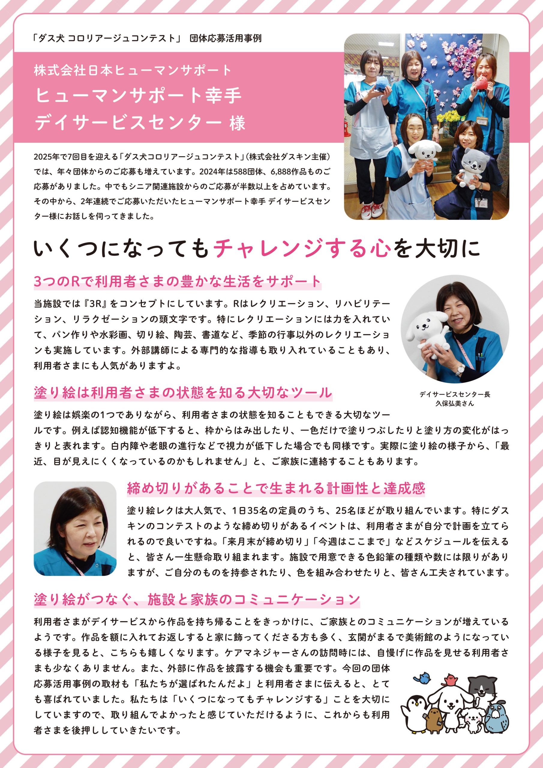 2025年で第7回を迎える『ダス犬コロリアージュコンテスト』において、当社ヒューマンサポート幸手デイサービスセンターが団体応募活用事例として紹介されました。