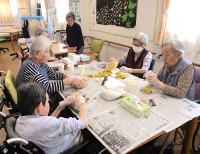 特定3階でクッキング倶楽部で✨チョコ🍫バナナ🍌✨作りを行いました。半分に切った🍌バナナ🍌に“おうちで簡単チョコ🍫バナナ🍌”の🍫チョコレート🍫を付けようとしますが「簡単につかないね!」「これでいいのかな...