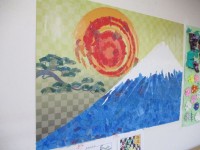 春は桜、夏はひまわり、秋は紅葉を。今回冬バージョンでは、富士山の貼り絵を作りました。富士山と朝日?が、ダイナミックで素敵な作品になりました(≧▽≦)