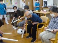 7月に入り猛暑日が続いています🍉この暑さに負けずに皆様、お元気に運動を楽しんでいます♪(*^-^*)力いっぱいに棒を動かしてボールを転がしゴール⚽!