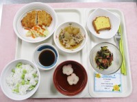 本日のお昼ご飯は、『父の日』の特別メニューです。右上は、本日のおやつ、ドライフルーツのパウンドケーキ。父の日らしい、ボリューム満点メニューで美味しそうですね🎶(*´ω`*)
