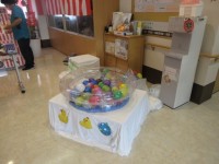 ボールプールには色とりどりのヨーヨー、あひる、小判、金魚とたくさんのお宝を浮かべましたよ射的のお兄さん、甚平姿で登場「射的は黒文字を切り抜いて斜めに貼ったらカッコイイよね~」なんと、射的の置き台は...