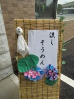 時折風は吹くものの、曇りで蒸し暑いですが、夏の行事、流しそうめんを行いました。去年は施設内のダイニングでしたが、今年は玄関前です。外の方が気分が盛り上がりますね。つけヅユ2種(めんつゆと梅味だれ)と...