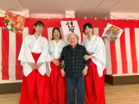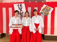 巫女さん達との記念撮影会がスタートしました会場の装飾の凧は施設職員の他、本部の職員もお手伝いして下さいました。新年会の雰囲気が良く出てますね。凧の前でも記念撮影