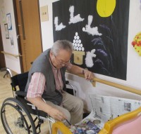 ご利用者様がウォールアートで15夜をイメージした作品を作成してくださいました。そこに水彩で絵を書いて下さいました。ウォールアートに躍動感が見られています。完成です。