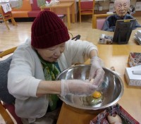 1Fとお客様と一緒に、蒸しパン作りを楽しみました。最初は卵を割るところです。次に他の材料と一緒にして、かき混ぜて頂きました。最後の工程で、型に材料を入れて頂きます。電子レンジでチンして、【完成】皆さ...