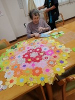 手芸俱楽部の様子です手を動かす時間はとても楽しいひとときです(*^▽^*)ひと針ひと針色とりどりの布をつなぎ合わせて作品が出来上がっていきます~完成が楽しみですね(*^▽^*)