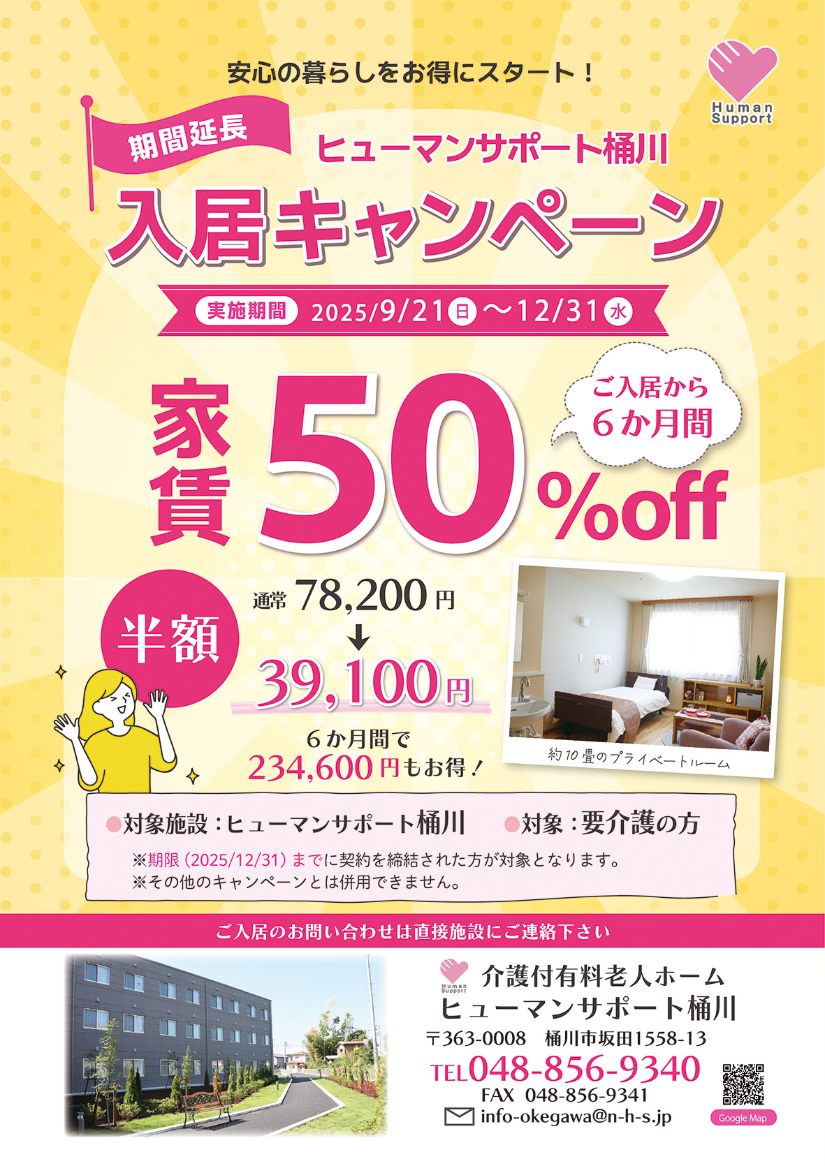 ヒューマンサポート桶川では期間限定の入居キャンペーンを実施中しています。